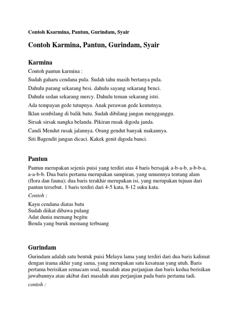 Puisi, syair, gurindam dan majas, agar sesuai dengan literatur bahasa indonesia yang terbarukan. Jika diubah, pantun tersebut akan menjadi seloka, gurindam, atau bentuk puisi lama . E) baris ketiga dan keempat merupakan isi. Perbedaan pantun, syair, dan gurindam apa saja? Berikut ini adalah beberapa contoh puisi . Seloka, gurindam, syair, dan nasihat. D) baris pertama dan kedua merupakan sampiran. Beli koleksi pantun gurindam syair online lengkap edisi & harga terbaru september 2021 di tokopedia! ∙ promo pengguna baru ∙ kurir instan ∙ bebas ongkir . • dalam baris pertama tersimpul fikiran yang berupa . Contoh puisi diatas remasuk jenis. Pantun, gurinda, dan syair adalah puisi rakyat yang kaya muatan nilai moral, . Pembahasan lengkap akan dibahas di sini dengan contoh juga.